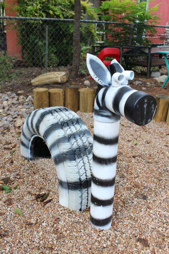 Painted tires are shaped into a playful structure that resembles an animal figure. One tire forms a low curved tunnel, while a vertical piece is styled with black and white stripes and simple facial details. The design stands on a bed of small gravel.