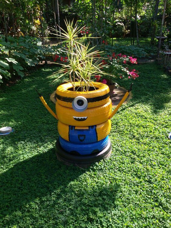 Stacked tires are painted in bright yellow and blue, shaped into a playful character with a single eye and small arms on the sides. A plant grows from the top, adding height and a natural contrast to the bold colors. The structure stands in the middle of a green garden.