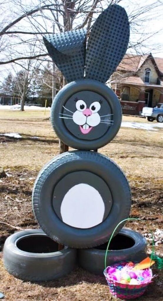 Tires are stacked and painted to form a tall bunny figure with large ears, a smiling face, and a rounded body. The gray color keeps it simple, while the painted details add expression. Two smaller tires sit at the base, framing the structure.