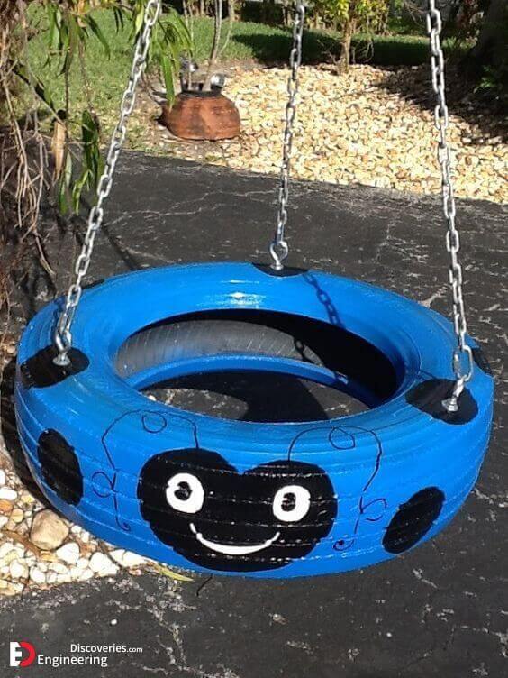 A blue tire is suspended with metal chains, lifted slightly off the ground. The surface is painted with a playful face design, adding a light and creative touch. The open center keeps the structure airy while still usable as a resting spot.