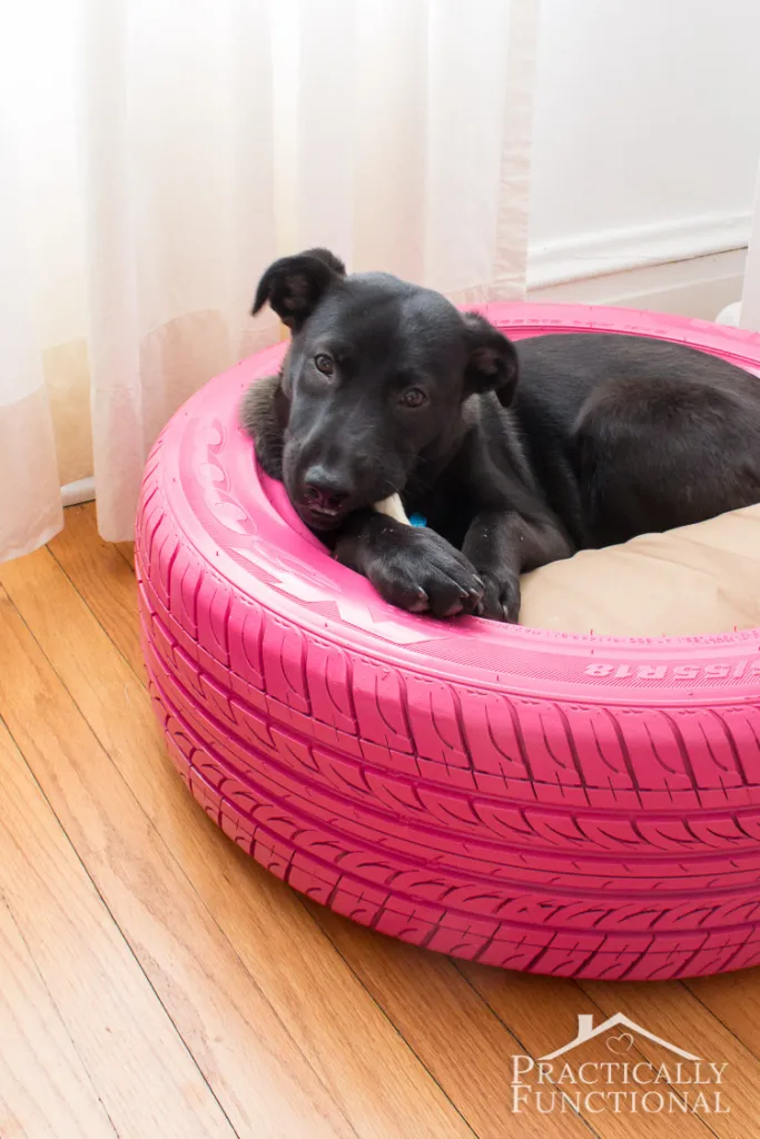 A bright pink tire sits on a wooden floor, turned into a cozy resting spot. Inside, a soft beige cushion fills the center, giving the dog a comfortable place to curl up. The raised edges of the tire act like a natural frame, helping the bed feel secure.