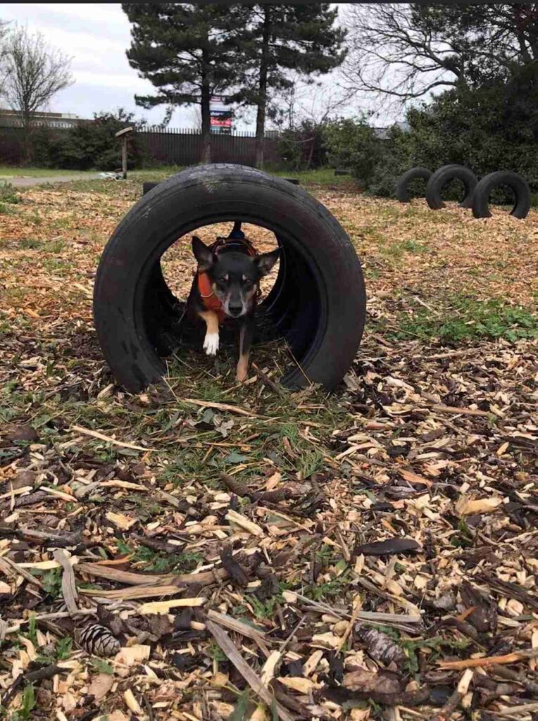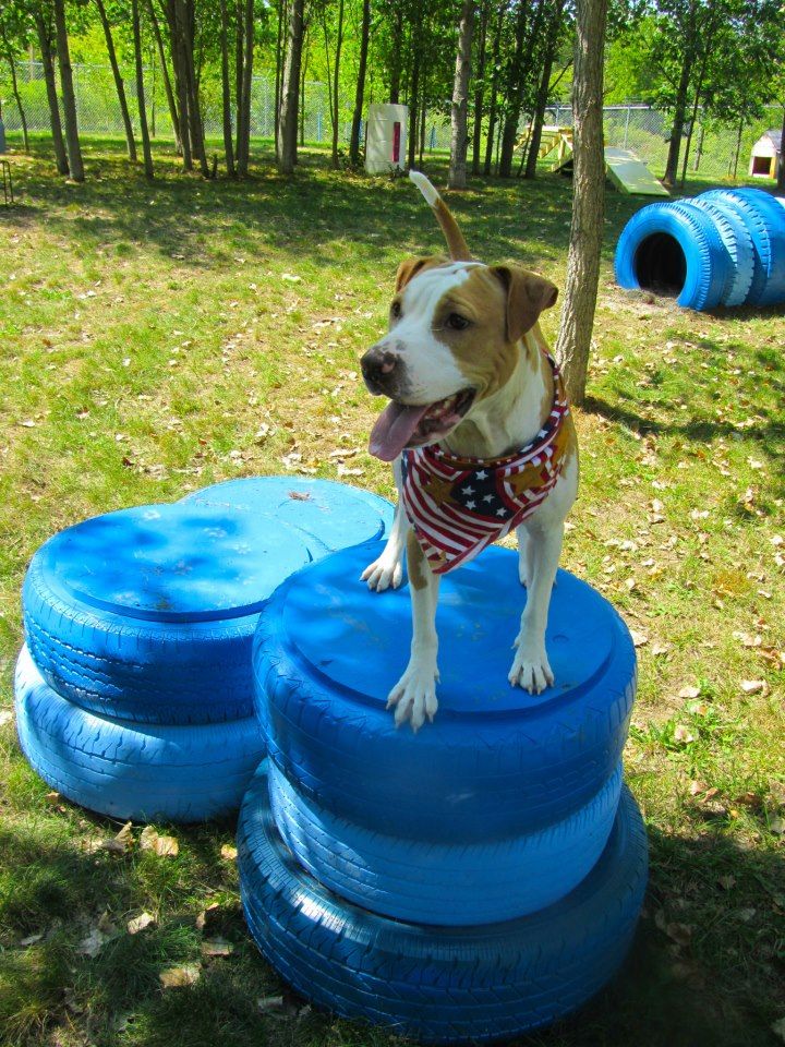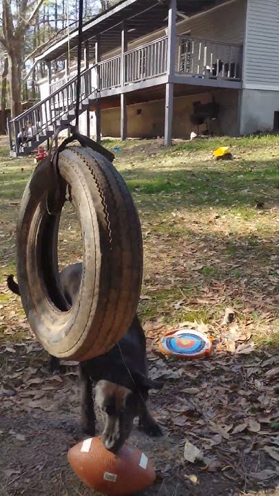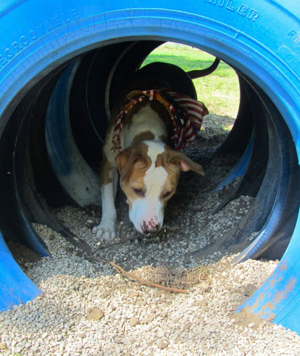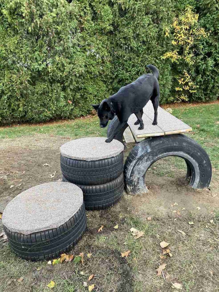 More tires are spaced in the background, hinting at a simple obstacle course. This setup encourages movement and curiosity, giving dogs a fun way to explore and stay active outside.