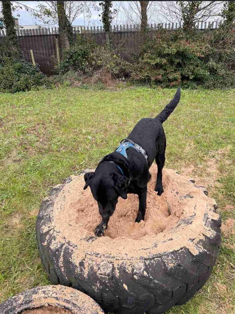 A large tire is set flat on the ground and filled with sand, creating a contained digging area. The dog stands inside, actively pawing through the sand, showing how it works as a play zone. The raised edges help keep the sand from spreading across the yard.