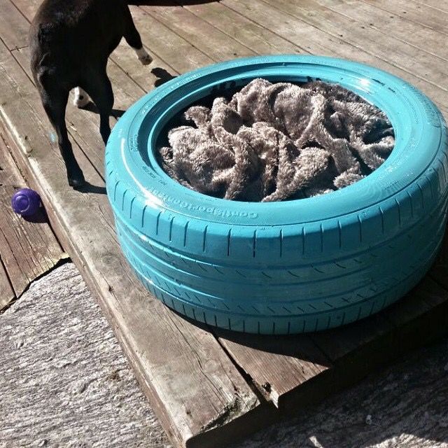 A teal painted tire sits on a sunlit wooden deck, filled with a thick, plush blanket. The soft fabric creates a relaxed spot where a dog can curl up after playing outside. Its round shape naturally holds the bedding in place, keeping everything contained.