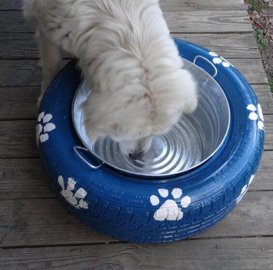 A blue-painted tire rests on a wooden deck, decorated with small white paw prints. In the center, a metal bowl fits snugly, creating a stable spot for water. The tire keeps the bowl from sliding around, which helps reduce spills during drinking.