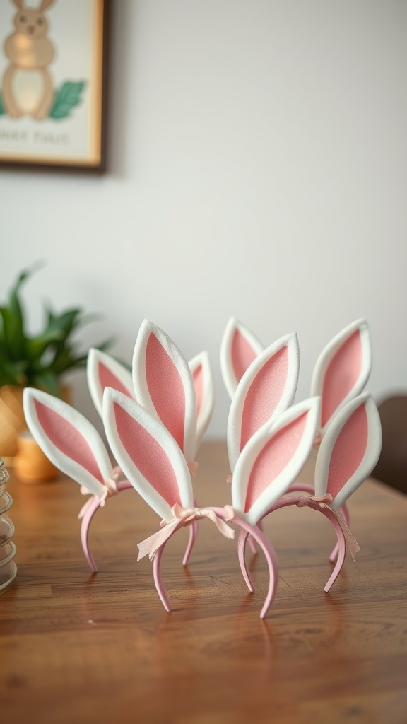 The image shows several bunny ear headbands lined up on a table. Each headband features soft pink and white foam, giving them a charming and playful look. The pink lining inside the ears adds a lovely pop of color, making them eye-catching and inviting.