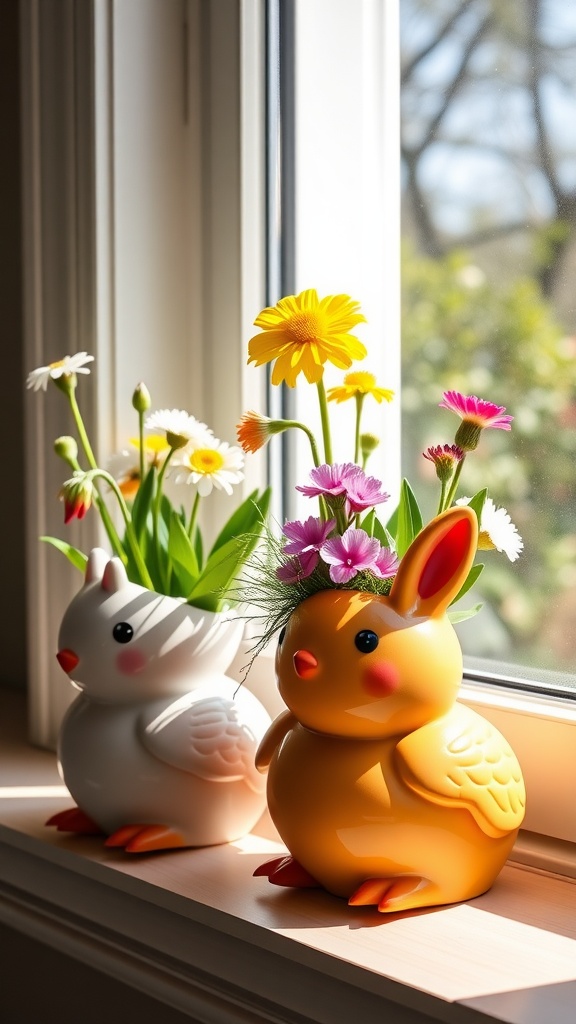 The image shows two charming planters—one shaped like a chick and the other like a bunny. Each planter is filled with vibrant flowers, making them a delightful addition to any window sill. The playful design of the chick and bunny adds a festive touch, inviting the joy of Easter into your home.