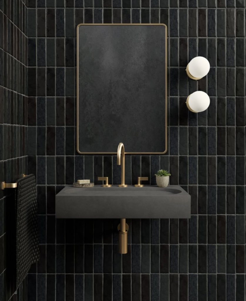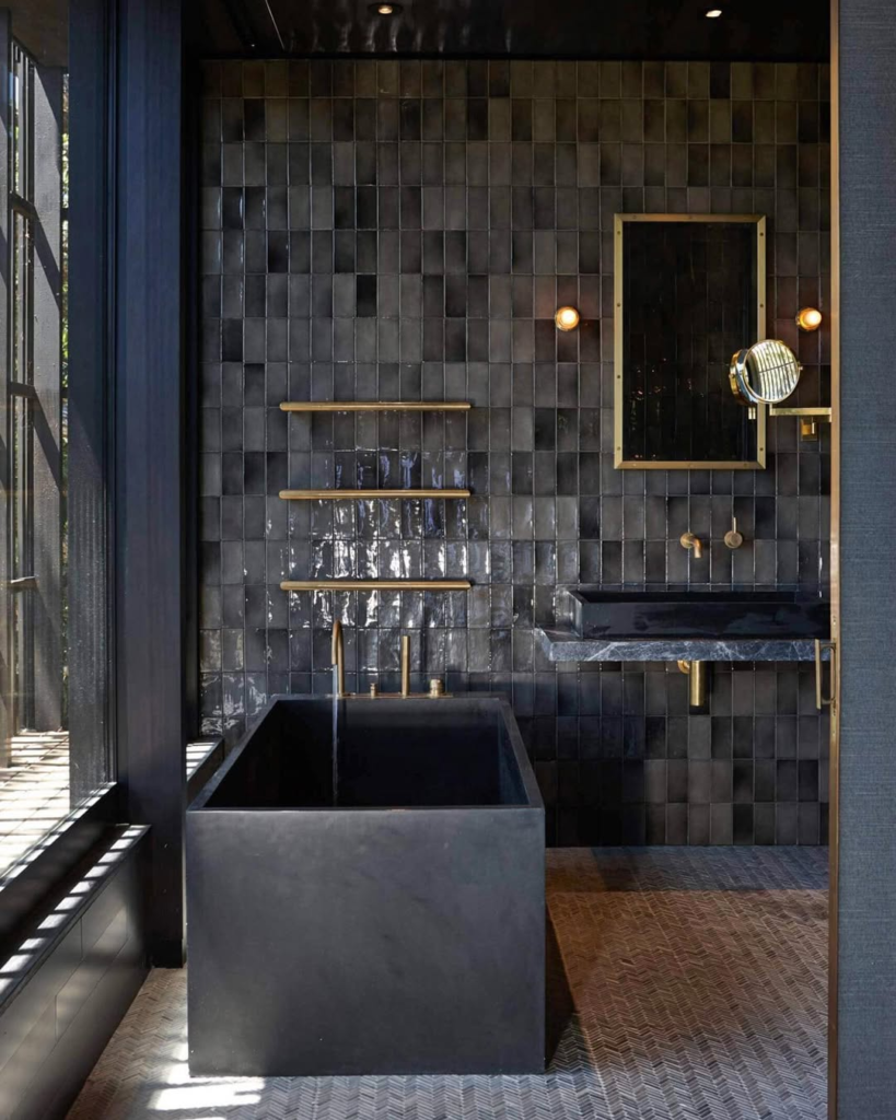 The vertical orientation of the dark tiles gives the illusion of height, making the space feel more open despite the dark color palette. The warm brass accents pop beautifully against the deep tiles, adding a touch of sophisticated luxury and warmth. This bathroom feels incredibly chic and contemporary, with a strong sense of deliberate design.