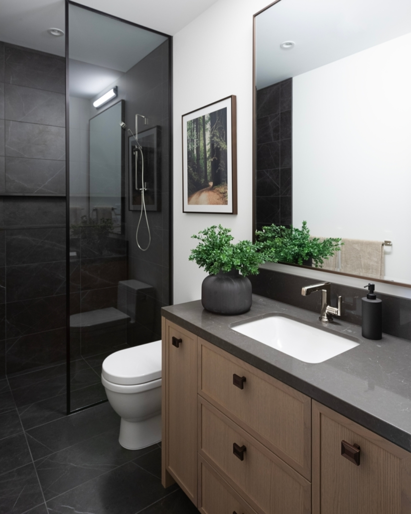 The interplay of dark tiles and the lighter wood vanity grounds the space while adding warmth and textural interest. The fresh greenery brings life and a calming natural element, making the sleek design feel more welcoming. This bathroom feels both contemporary and cozy, a stylish blend of modern design and natural comfort.