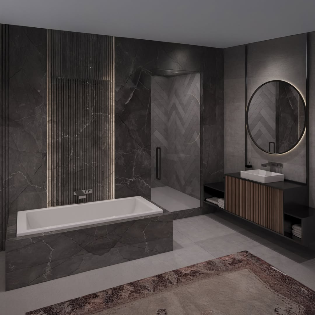 The combination of cool marble and warm wood tones creates a sophisticated yet comfortable aesthetic. The marble’s natural veining adds organic texture and visual interest, while the wood brings a grounding, natural element. This bathroom feels expansive and modern, offering a serene environment with rich material depth.