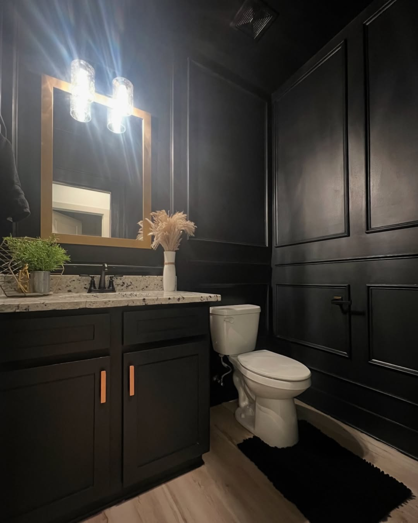 This striking image presents a powder room fully enveloped in sleek black paneling, creating an undeniably dramatic and luxurious statement. A white toilet stands out against the dark backdrop, and a minimalist vanity with a white marble-look counter adds a touch of brightness. Gold-framed artwork and light fixtures provide a captivating contrast and a glamorous sparkle.