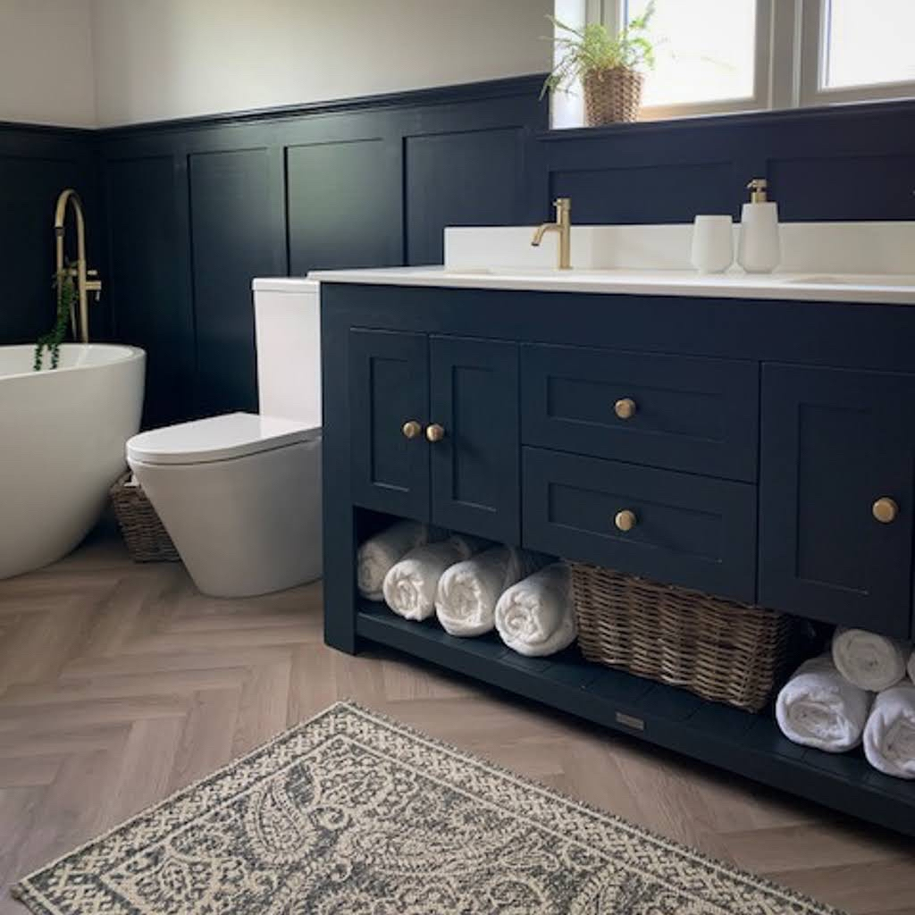 Here we see a spacious bathroom featuring beautiful navy wainscoting that extends around the lower half of the walls, creating a substantial and elegant foundation. A large double vanity in a matching navy hue, topped with a crisp white counter and brass hardware, offers ample storage and a touch of golden warmth. The flooring is a lovely light wood laid in a herringbone pattern, softened by a patterned rug.