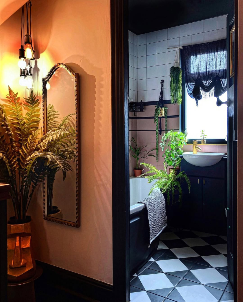 This image captures a peek into a dark and atmospheric bathroom from a warm, inviting hallway. The hallway, bathed in a soft peachy glow, features a tall, ornate gold mirror and lush artificial ferns, creating an intriguing entrance. Inside the bathroom, deep charcoal walls contrast with white subway tiles, and a black and white checkered floor carries through. Vibrant green plants hang and sit around the sink area, adding life.