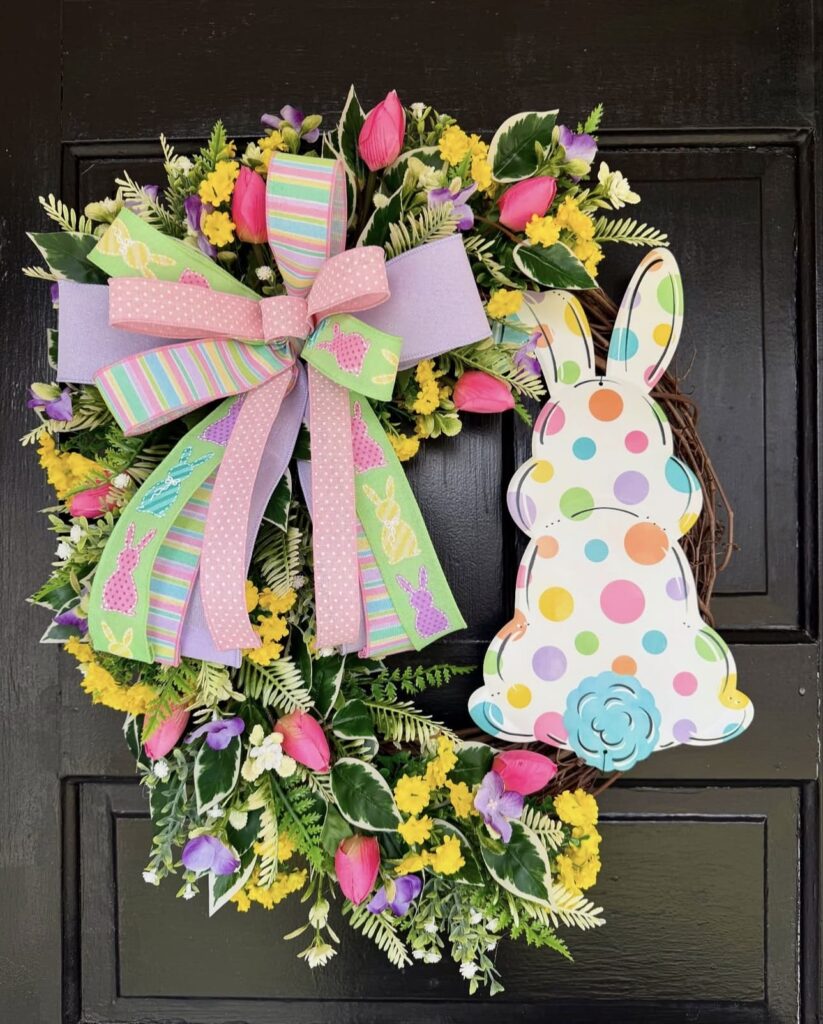 A rustic grapevine base serves as the backdrop for vibrant pink tulips and sunny yellow wildflowers. A large, playful wooden bunny silhouette with colorful polka dots sits off-center, balanced by a massive multi-patterned bow.
