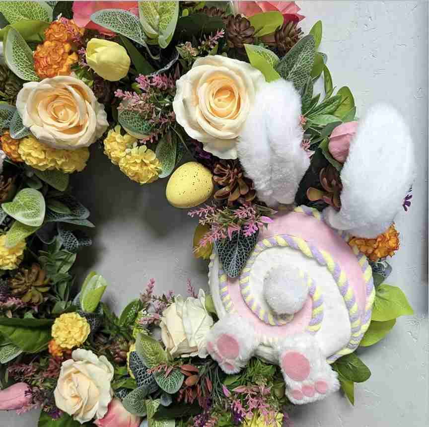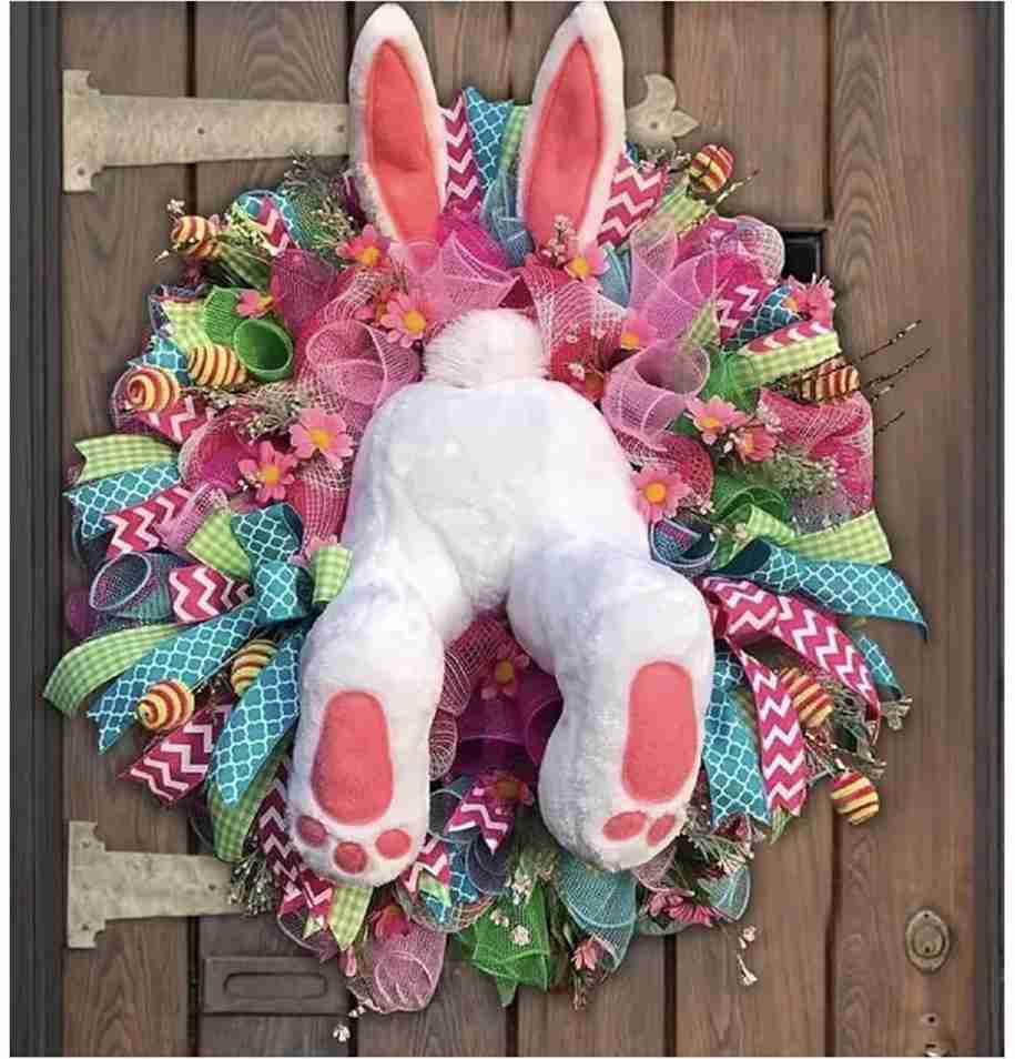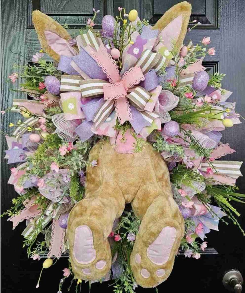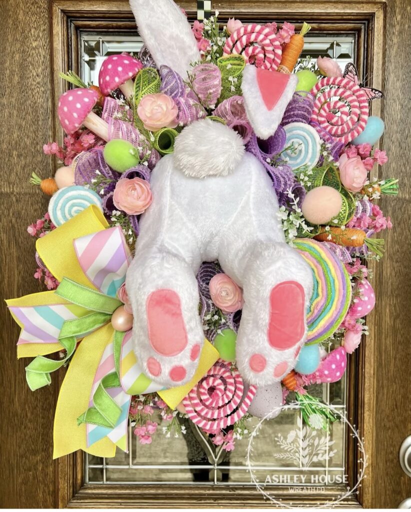 Visually, the symmetry of the bunny legs provides a focal point amidst the chaotic and fun textures. It feels mischievous and lighthearted, perfect for a house with little ones. Use deco mesh to add significant volume without adding too much weight to your door.