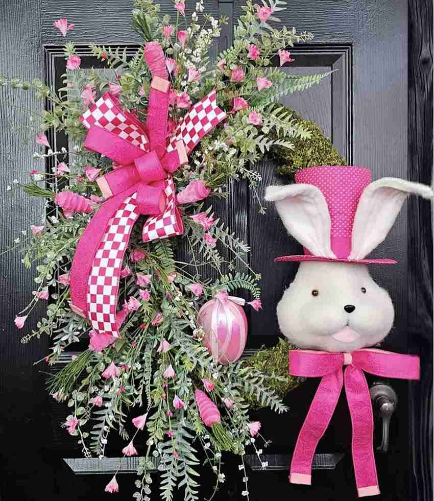 This unique wreath features a moss-covered base shaped like a rabbit, complete with a dapper white bunny face wearing a pink polka-dot top hat. Long trails of pink flowers and checkered ribbons cascade down one side, creating a sense of movement.