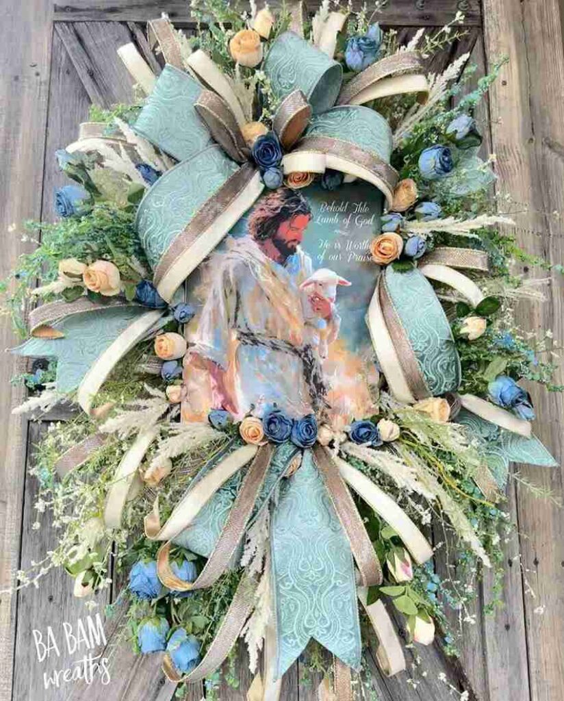 Centered in this ornate wreath is a beautiful portrait of a shepherd holding a lamb, surrounded by pale blue and peach roses. Massive, shimmering champagne ribbons and airy white sprigs create a frame that feels almost ethereal.