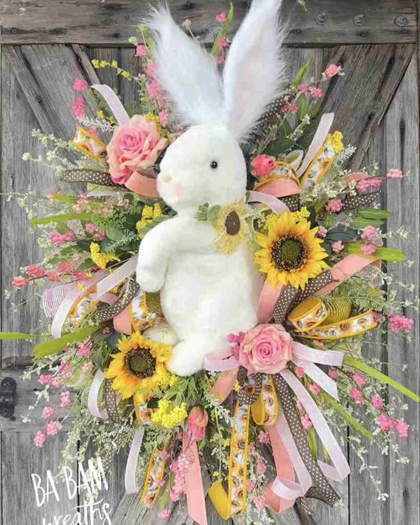The mix of high-summer sunflowers with spring bunnies creates a unique, transitional look. It feels sunny, bright, and incredibly friendly. Try mixing different types of flowers, like roses and sunflowers, to create a more “wildflower” garden feel.