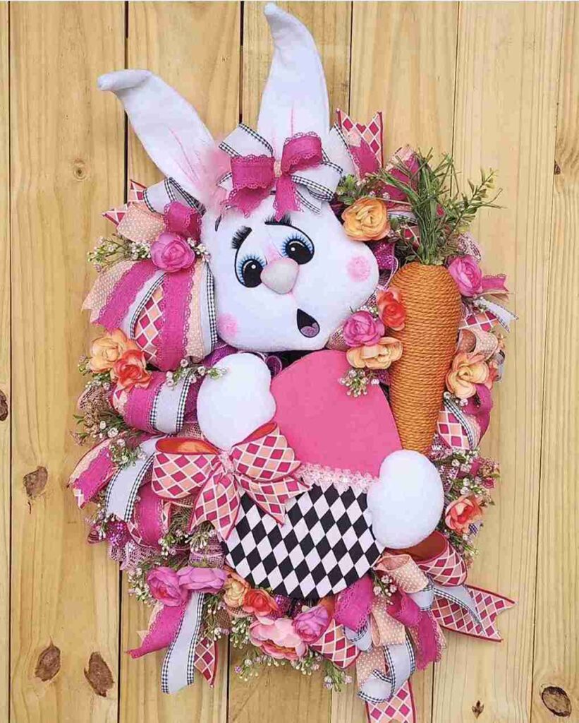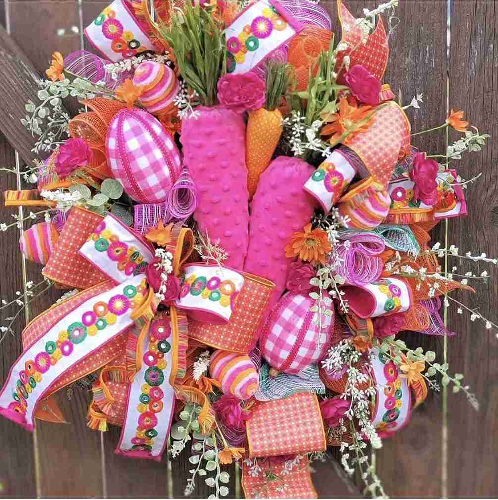 This wreath is an explosion of hot pink and orange, featuring large plush carrots and gingham-patterned eggs. Layered ribbons with colorful embroidered circles add a bohemian and crafty touch.