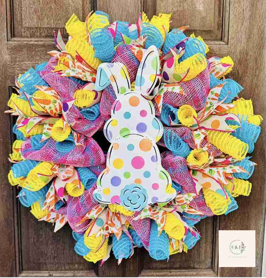 A flat, polka-dotted bunny cutout is centered on a wreath made of tightly curled deco mesh in blue, yellow, and pink. Carrot-patterned ribbons peek out from the curls, adding a thematic touch to the colorful ruffles.