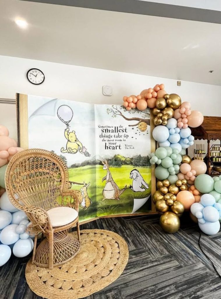 This incredible setup features a giant, life-sized open storybook backdrop featuring Winnie the Pooh and his friends in the Hundred Acre Wood. A vintage-style white wicker peacock chair sits on a round jute rug, framed by an asymmetrical cluster of balloons in shades of peach, gold, sage, and pale blue.