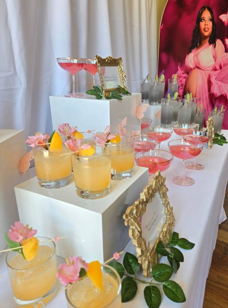 The mood is light, refreshing, and celebratory, perfect for a daytime event where the focus is on “cheers-ing” the new arrival. It feels upscale yet approachable, giving guests a fun place to mingle and sip on something beautiful.