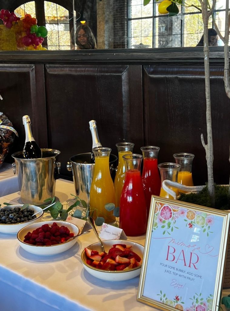 This classic mimosa bar features chilled bottles of bubbly in silver buckets alongside glass carafes filled with bright orange and red fruit juices. Bowls of fresh blueberries, raspberries, and sliced strawberries sit ready for topping, accompanied by a framed sign with floral accents.