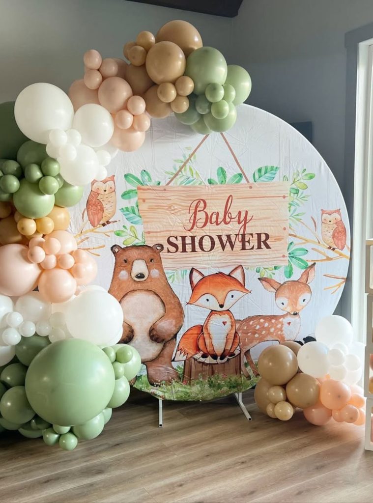 The circular shape of the backdrop acts as a perfect frame for photos, while the muted, earthy tones feel modern and gender-neutral. Using various sizes of balloons in the garland adds a professional, bubbly texture that mimics the organic feel of the forest.