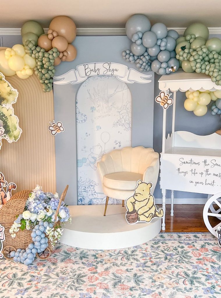 This elaborate indoor scene features a soft blue arched backdrop with delicate sketches of Pooh and Piglet, paired with a plush cream-colored velvet chair. A white “Sweet Treats” cart and a wicker bassinet overflowing with blue hydrangeas and balloons complete the picturesque setting.