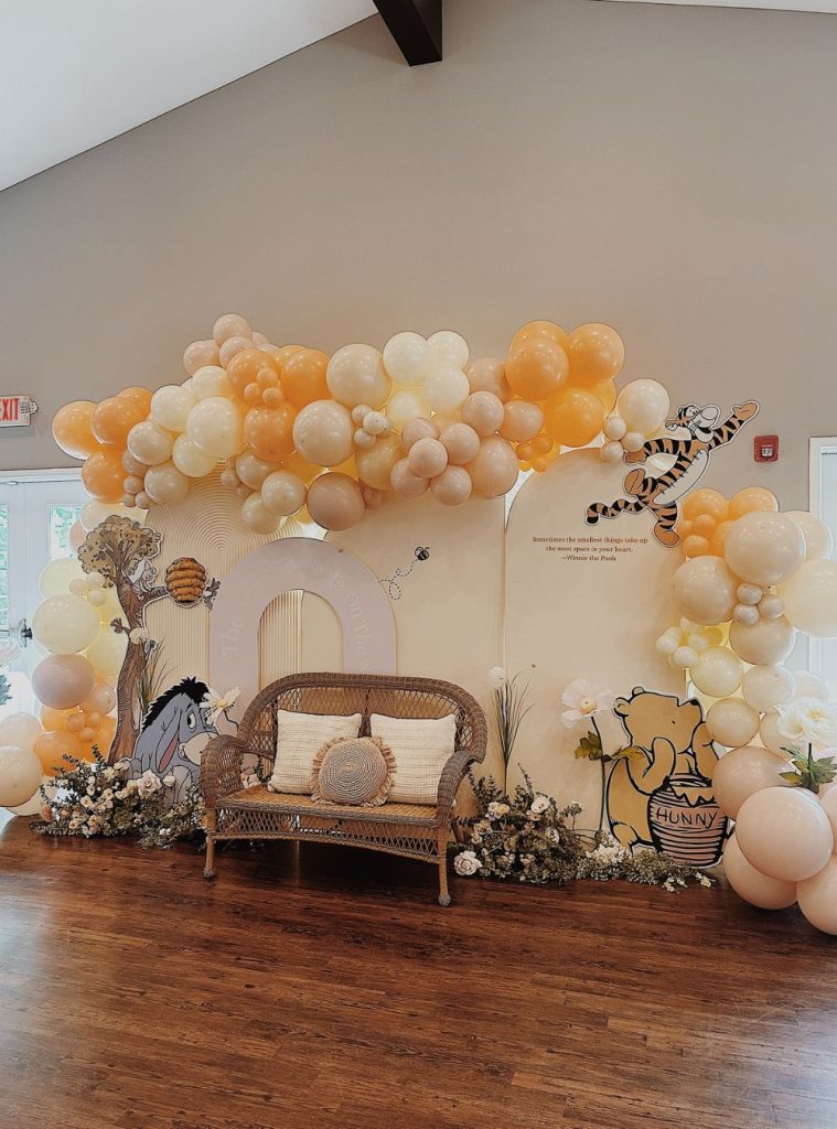 A charming wicker loveseat sits in front of a series of arched panels featuring Tigger, Eeyore, and Pooh under a canopy of honey-colored balloons. The base is accented with clusters of dried wildflowers and “hunny” pots, creating a warm, golden glow.