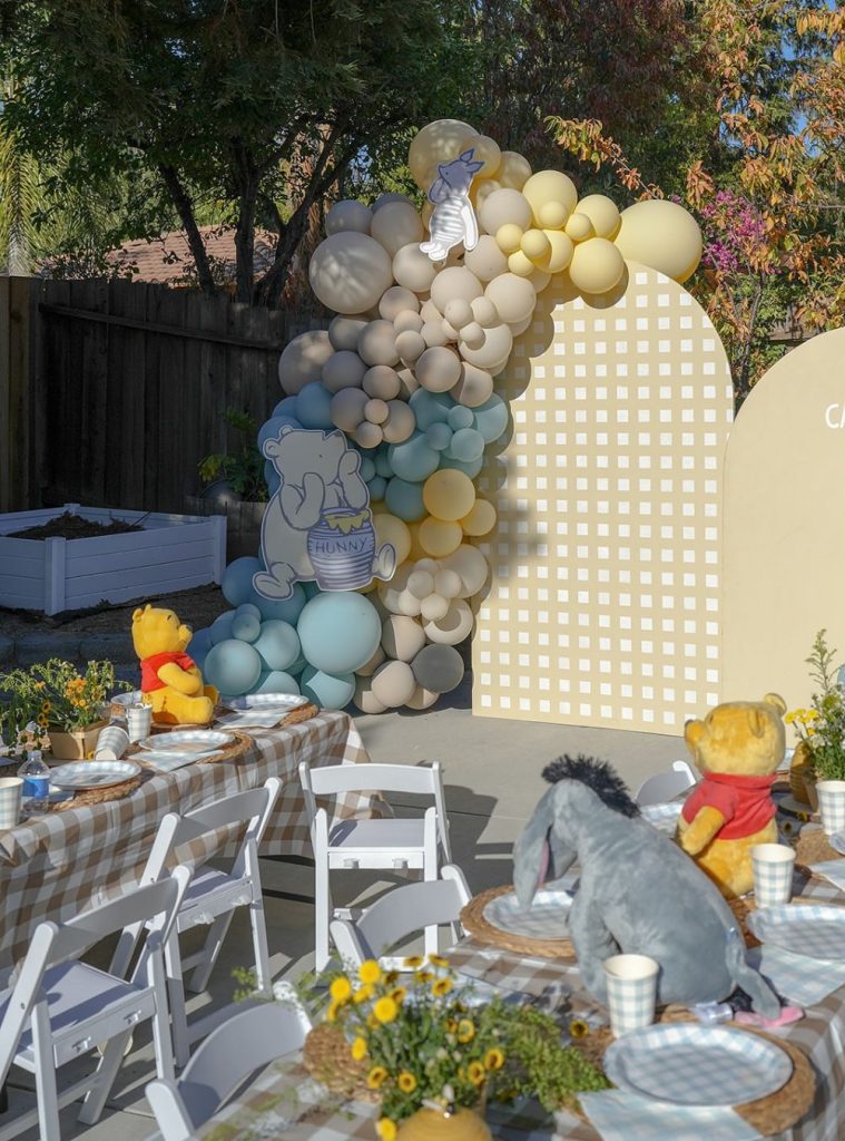 An outdoor picnic table is dressed in a tan and white gingham tablecloth, topped with woven chargers, sunflowers, and plush Pooh characters. Behind the table, a large checkered backdrop is framed by a cascading balloon garland in muted blues, greys, and yellows.