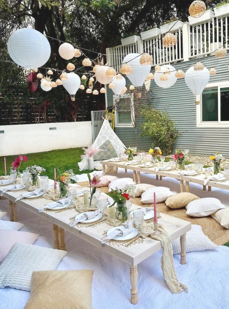 If you are worried about grass stains, layering several large outdoor rugs under the tables provides a clean, cozy foundation.