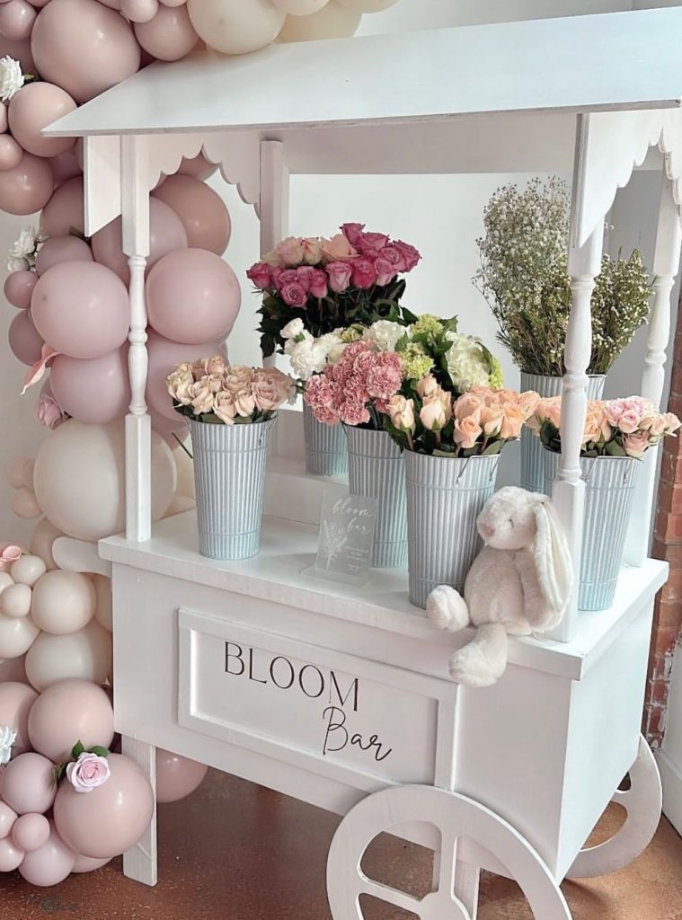 A white vintage-style flower cart is stocked with galvanized buckets full of pink roses, white carnations, and baby’s breath. A “Bloom Bar” sign sits on the counter next to a soft plush bunny, all framed by a gorgeous pink and cream balloon arch.