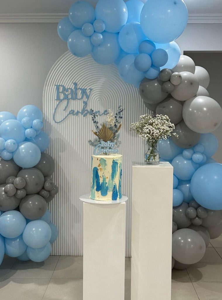 This modern setup features a white textured ribbon-style arched backdrop with a custom “Baby Carbone” sign in a matching dusty blue. A blue and grey marbled cake sits on a white pedestal, framed by a massive balloon arch in slate grey and bright sky blue.