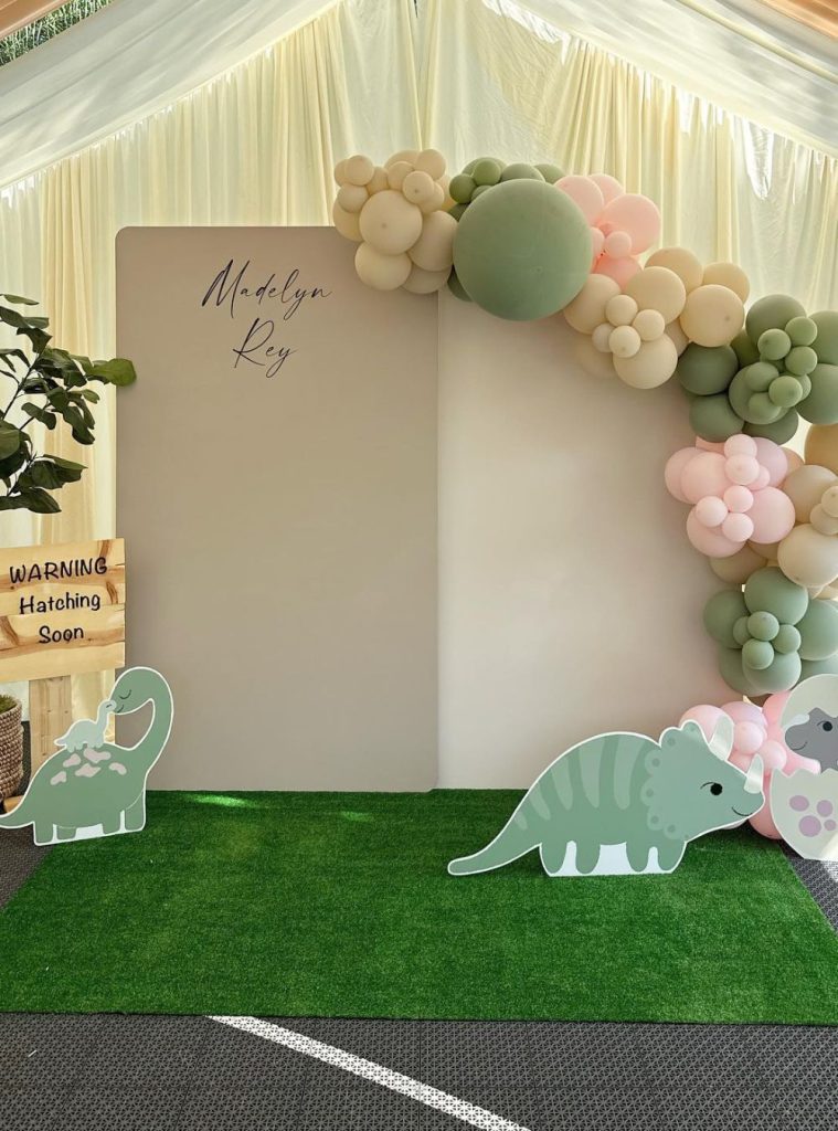 This creative dinosaur-themed setup features a large sage green and tan balloon arch over a “Warning Hatching Soon” wooden sign. Cute cutouts of long-neck dinosaurs and a baby dino in an egg sit on a patch of bright green artificial turf.