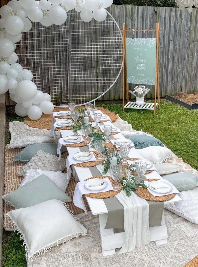An outdoor picnic features a long white wooden table with woven chargers and sage green napkins, set under a large white mesh circular frame. A pristine white balloon garland with tiny sprigs of baby’s breath curves around the hoop, while guests sit on oversized floor cushions.