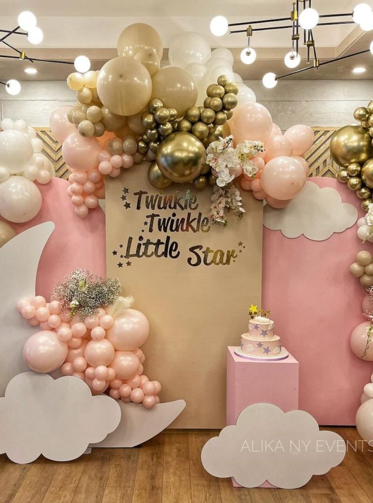 A soft pink and gold version of the “Twinkle Twinkle” theme features a large tan backdrop with gold lettering and a two-tier star-themed cake. Fluffy white clouds and a giant crescent moon are nestled among clusters of matte pink and metallic gold balloons.