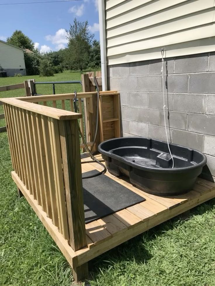 Creating a DIY dog wash station is a fun and practical project for any dog owner. The image shows a simple yet effective setup. It features a sturdy wash station with a large basin, perfect for giving your pup a bath right in your backyard.