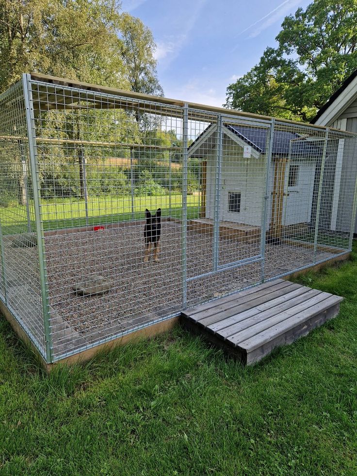 The fence itself is sturdy, providing a clear boundary. This is essential to prevent any escapes and to keep unwanted animals out. The grass is well-kept, making it a comfortable spot for dogs to lounge and play. You can also see some trees in the background, adding a touch of nature to the environment.