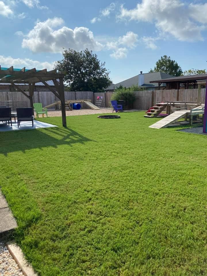 Creating scent trails in your backyard can turn a simple space into a playground for your dogs. The image shows a few dogs happily exploring a yard, with a clear path leading them through the grass. This setup encourages them to sniff around and discover new scents, which is natural behavior for dogs.