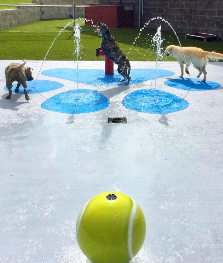 In the image, you can see a vibrant splash pad with several dogs enjoying their time. The water sprays up from the center, creating a fun atmosphere. Brightly colored balls float in the water, adding to the playful vibe. The dogs seem happy and excited, splashing around and enjoying the warm weather.