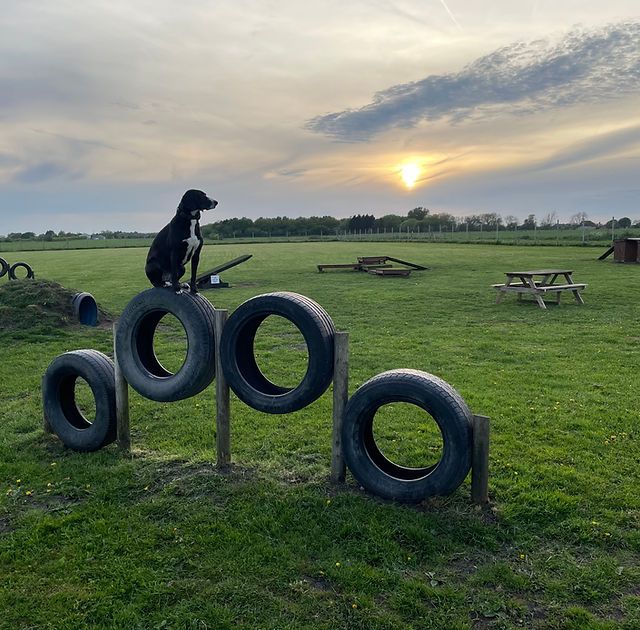 Setting up this kind of space doesn’t have to be complicated. You can use simple items like cones, hurdles, and tunnels to create an exciting course. The bright red equipment in the image stands out against the green grass, making it easy for dogs to see and navigate.