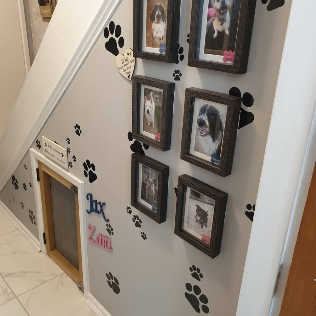 This is a fantastic example of using previously wasted space under the stairs to create a personalized and visually engaging dog den. A small, wood-framed door offers access to the enclosed area, while the surrounding wall is transformed into a gallery dedicated to the family’s dogs. The walls are adorned with black paw-print decals, six framed photos of different dogs, and cute wooden signs bearing names and heartwarming quotes.