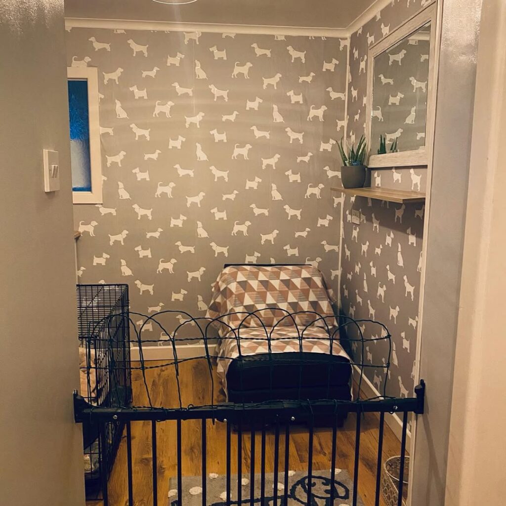 This is a sweet, small space fully dedicated to a dog, enclosed by a low baby gate that clearly designates it as the dog’s private area. The room is decorated with a playful, gray-and-white wallpaper featuring small dog silhouettes, adding a personalized and graphic element to the walls. The sleeping area includes a blanket-covered bed and a wire crate tucked into the corner, keeping the space secure and tidy.