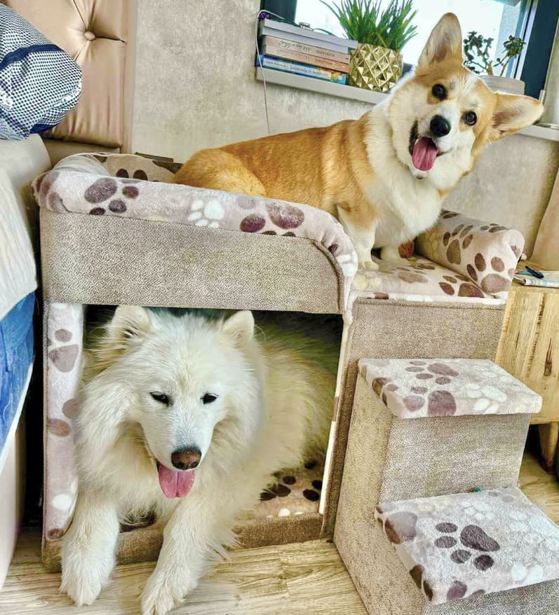 Perfect for a multi-dog household, this adorable, tiered pet furniture acts as both a cozy double-decker bed and a set of stairs. A fluffy white Samoyed is resting comfortably in the cave-like lower bunk, while a cheerful Corgi is perched atop the upper level, which looks like a mini couch. The entire structure is covered in a soft, paw-print patterned fabric, making it a cohesive and themed piece of furniture.
