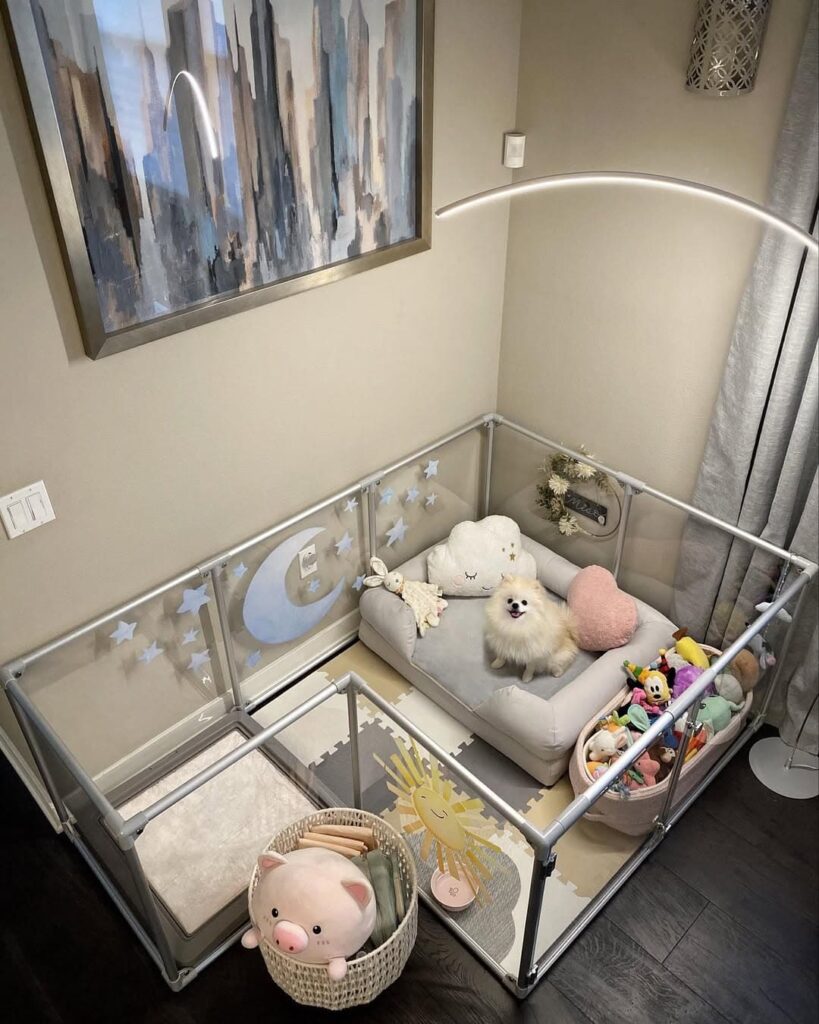 The visual appeal lies in the meticulous organization and the clear separation of “bed” and “play” zones within the pen, all housed within a very stylish room. This space feels incredibly pampered, safe, and utterly charming, a true sanctuary designed for ultimate puppy comfort. To try this at home, focus on a consistent, soft color palette (like grays and creams) and add a statement piece of art or lighting nearby to anchor the corner.