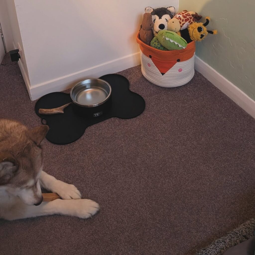 This simple corner is dedicated to feeding and play, featuring a stainless steel bowl set on a stylish, bone-shaped black mat to contain spills. A colorful, woven rope basket shaped like a fox is overflowing with plush, squeaky toys, adding a cheerful pop of color to the corner. The surrounding walls are a calm mint green and white, with dark carpet grounding the space.