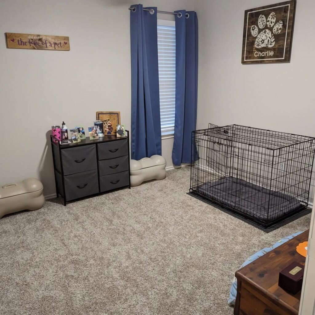 This dedicated dog room or corner focuses on practicality, featuring a large wire crate placed on a non-slip mat alongside a functional chest of drawers. The neutral gray walls and light gray carpet provide a calm backdrop for the dark blue curtains and a decorative wooden plaque with a paw print design and the dog’s name, “Charlie.” Two bone-shaped, hard-sided containers flank the dresser, adding specialized storage for food or toys.