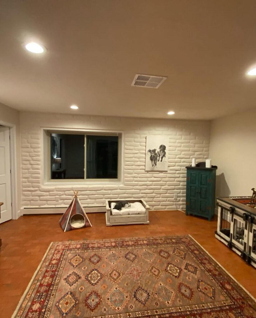 This photo showcases a stylish, dedicated dog corner featuring a white, wood-framed bed and a whimsical canvas teepee, both resting on a large, patterned rug. The room itself has beautiful textured white brick walls, terracotta-colored tile floors, and recessed lighting, giving the space a rustic yet contemporary Southwestern feel. A small dark turquoise cabinet and a sophisticated kennel that doubles as a console table flank the wall, showing great use of functional pet furniture.