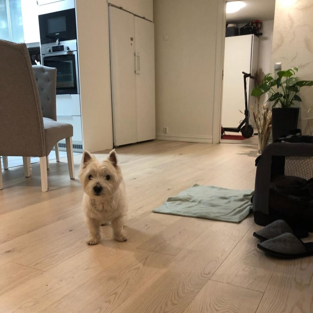 A Westie is captured standing happily on light, polished hardwood floors in an open-concept living area near the kitchen. On the floor nearby, a simple, soft green mat and an open-sided crate or soft carrier are clearly designated as the dog’s resting space. The surrounding décor is modern and light, with neutral furniture and a simple houseplant in the corner.